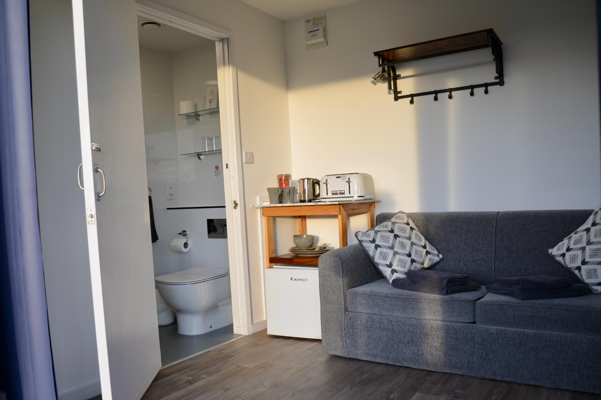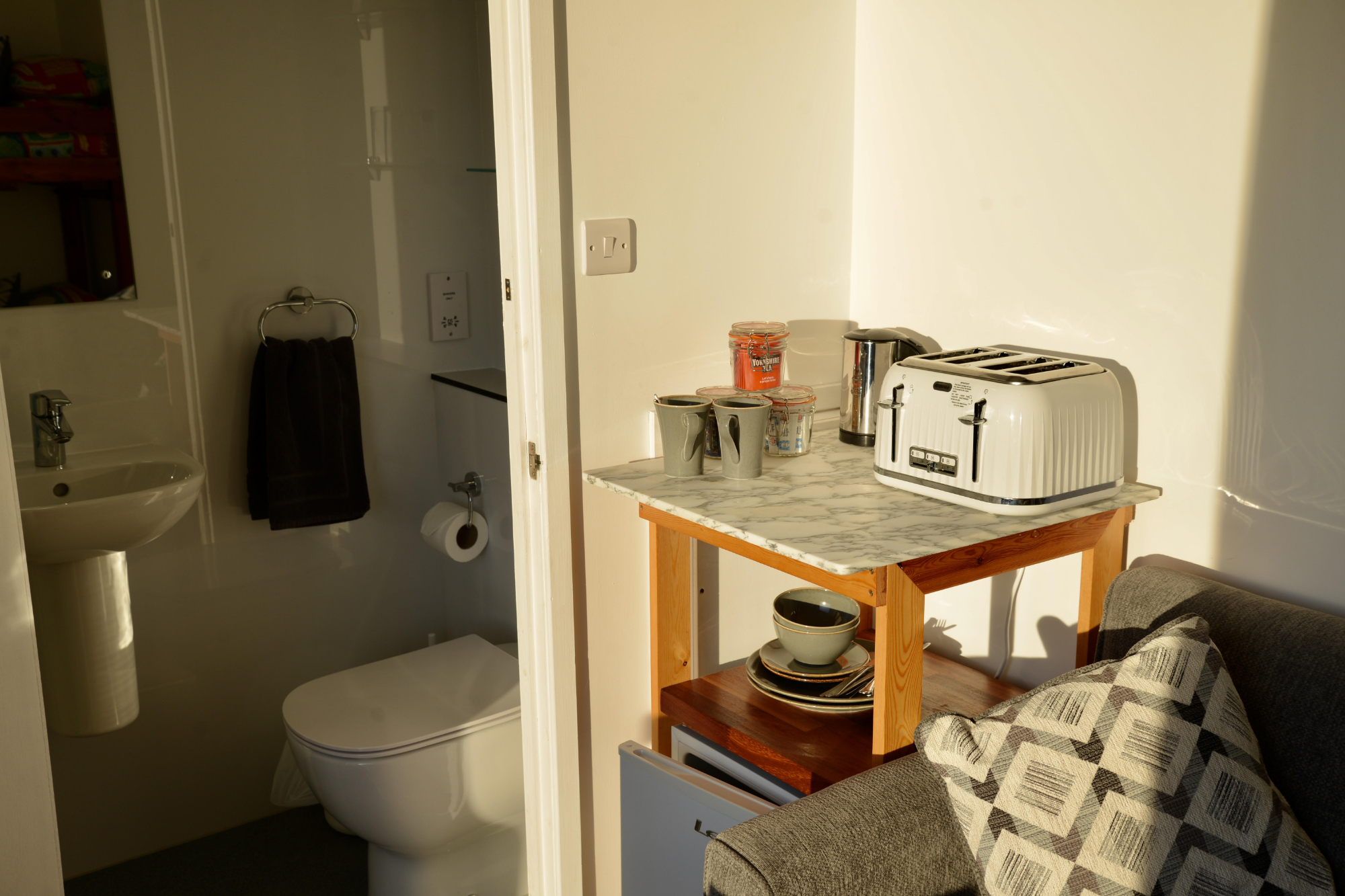 • Pods contain: Bunk Bed, Wifi, En-suite shower room, Tea/Coffee making facilities and Kettle, Toaster, Fridge, Heater, Electrical sockets, and Fold-up table and Chairs for indoor and outdoor use.